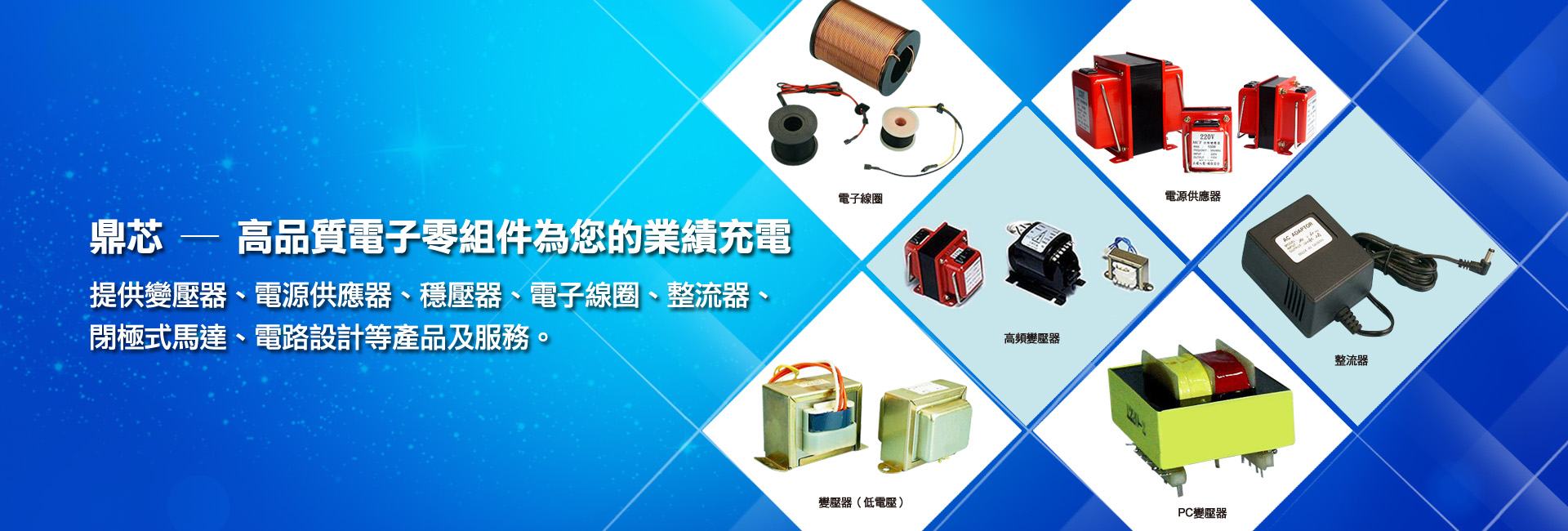 鼎芯有限公司 成立於西元2000年,專業生產製造各種大小型變壓器、DC整流器、電源供應器、大小電子線圈、電磁桶線圈、AC閉極式散熱馬達及DC馬達DA→AC、UPS.AC→AC降壓器等產品,歡迎客戶來樣指定設計製作及合作外銷。